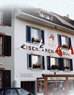 Max und Ursula Sutter-Weibel haben das Geschäft im Sommer 1993 in vierter Generation übernommen. Der Übernahme von den Eltern Max und Therese Sutter-Bottazzini war ein umfangreicher Umbau voraus gegangen. Gründer der Firma Sutter und der "Sutter - Dynastie" war der 1843 geborene Adolf Sutter-Stöckli, der als gelernter Schmied in dem damals schon fast 400 Jahre alten Haus die alte Schmiede übernahm und fleissig die Pferde der Wagen und Kutschen beschlug, die über die Nepomukbrücke gerumpelt kamen. Beim Geschäftsumbau 1993 waren noch die Spuren der alten Esse zum Vorschein gekommen. 1891 entschloss sich Afolf Sutter, aus der Schmiede eine Eisenwarenhandlung zu machen und vor allem auch landwirtschaftliche Geräte zu verkaufen. 1899 liess er die erste Inschrift mit dem Pferdekopf aus dem Jahre 1799 "Dies Haus steht in Gottes Hand - zur Schmiede wird's genannt" überholen und ankünden, was er zu verkaufen gedachte: |
