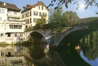 "Verkauf sämtl. Landwirtschaftl. Maschienen u. Geräthe, Pflüge, Jauchepumpen, Dezimalwagen". (Der Dekorationsmaler hat dies wortgetreu in Originaldeutsch von damals übernommen - er ist der Deutschen Rechtschreibung durchaus kund). Wer genau hinschaut, entdeckt auf einigen Buchstaben der Inschrift herzige Vögelein, dies sind die Markenzeichen des Dekorationsmalers Rogenmoser. Die beiden Familien Sutter dürfen mit Recht stolz sein auf diese gelungene Renovation, wofür sie viel Geld ausgegeben haben. Sie erhalten denn auch mündlich und schriftlich viel Lob und Anerkennung. Es lohnt sich auf jeden Fall, dieses Denkmal (wie übrigens den modernen Laden auch) einmal anzusehen. ![]() Die Nepomuk-Brücke |